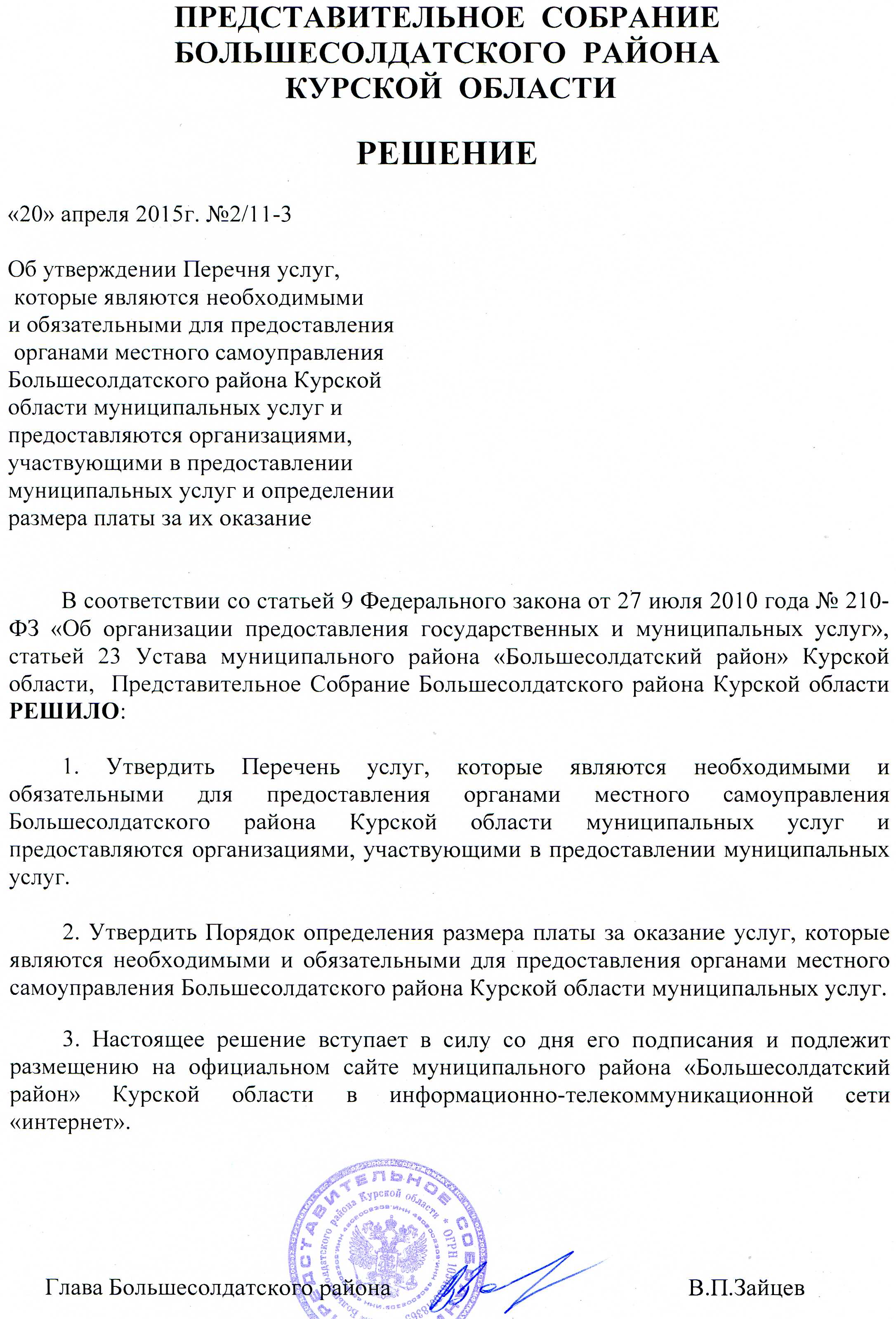Решение Представительного Собрания Большесолдатского района Курской области от 20 апреля 2015 года № 2/11-3 "Об утверждении Перечня услуг, которые являются необходимыми и обязательными для предоставления органами местного самоуправления Большесолдатского района Курской области муниципальных услуг и предоставляются организациями, участвующими в предоставлении муниципальных услуг и определении размера платы за их оказание"